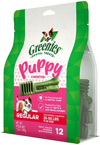 • Contains one (1) 12 oz. 12-count pack of GREENIES Puppy 6+ Months Regular Size Natural Dental Dog Treats; Natural Dog Treats Plus Vitamins, Minerals, and Other Nutrients