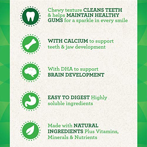 Details: Start your puppy off with healthy habits by giving them GREENIES Puppy 6+ Months Dental Treats! Perfect for clean teeth and gum care, these treats are made with easy-to-digest ingredients and have a 50% softer texture* for a gentle clean down to the gumline. These chewy puppy treats support brain development with DHA, and teeth and jaw development with calcium for your 25-50 lb. puppy. GREENIES Treats for Dogs are vet-recommended for at-home oral health care. These puppy dog chews are proudly made in Kansas City with quality ingredients from around the world since 1996. Celebrate your perfect puppy with these mouth-wowing, teeth-cleaning, grin-inducing GREENIES Dog Treats, and keep them and their teeth happy! Natural Dog Treats Plus Vitamins, Minerals, and Other Nutrients. * Compared to GREENIES Dental Treats Original